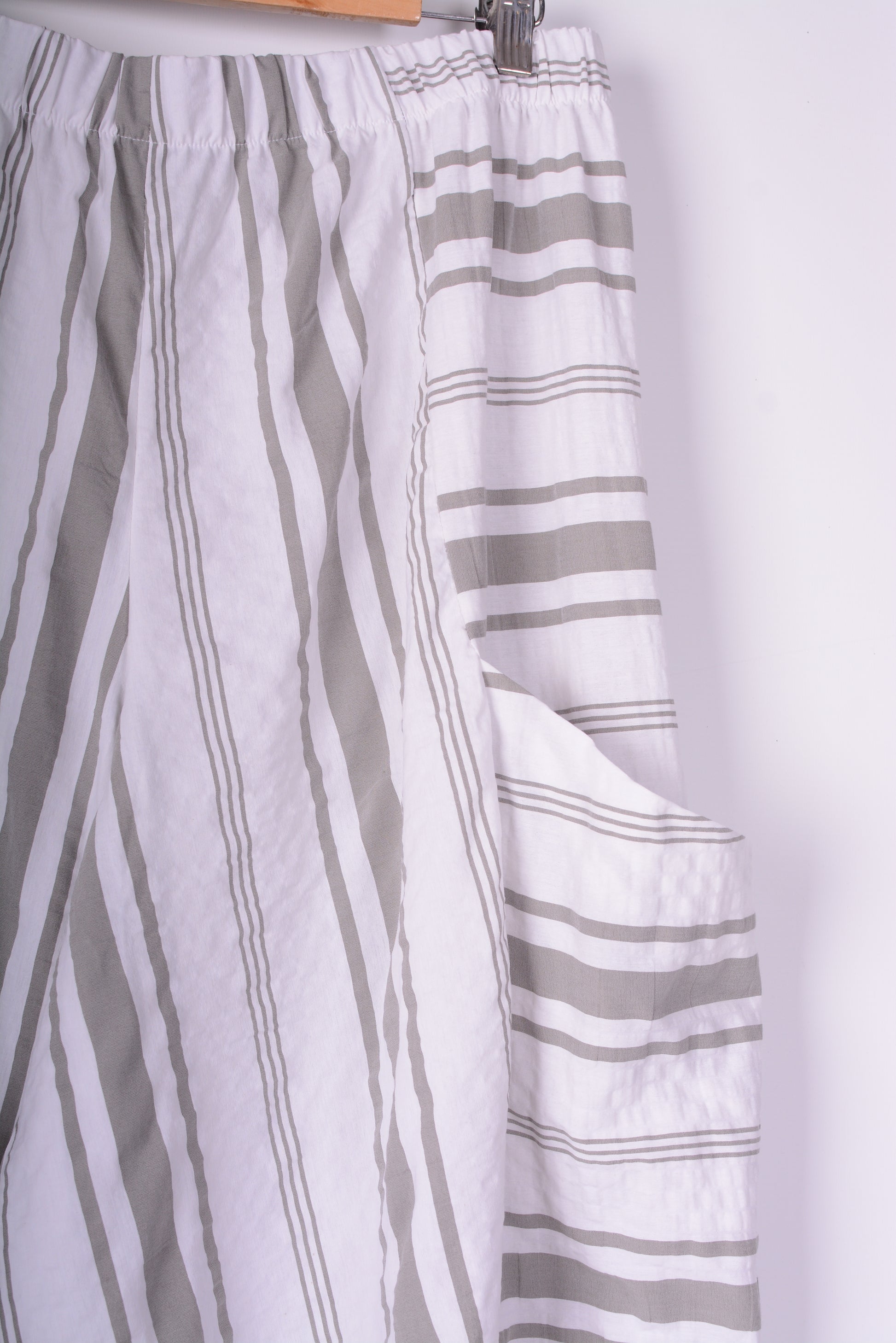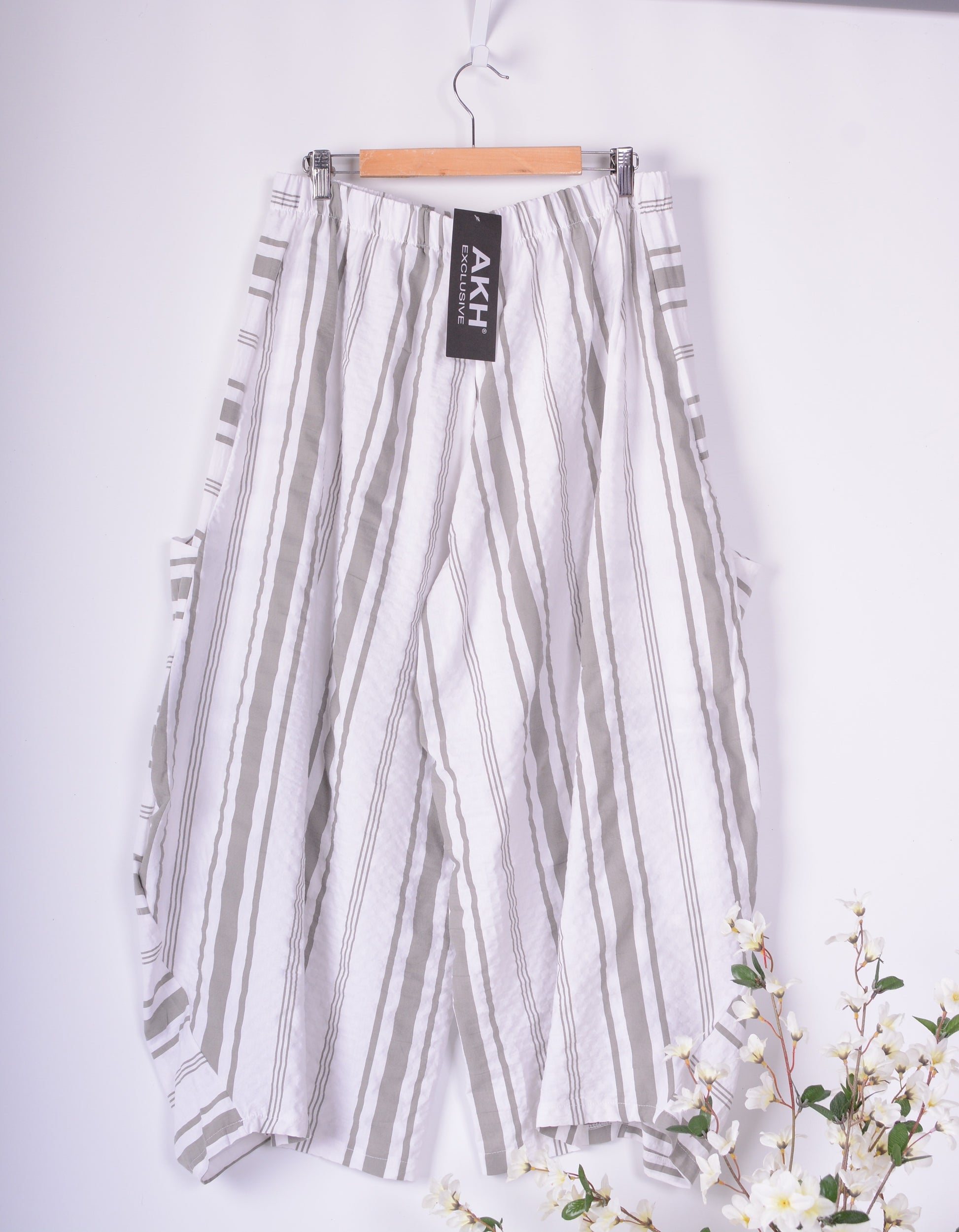 A beautiful pair of wide leg barrel trousers in a beautiful premium quality cotton mix fabric as you would expect from this brand. They hang perfectly in a barrel/balloon shape. In traditional Lagenlook style they feature large front pockets. The great length and comfy elasticated waist make them the perfect addition to your wardrobe. They have a lovely stripe pattern and look so cool on!
